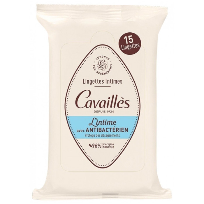 Cavaillès Lingettes Intimes Antibactérien 15 lingettes sont des lingettes sans rinçage, pour l'hygiène intime. Elles sont enrichies en prébiotique, surgras végétal pro-régénérant et extraits de thym antibactérien.