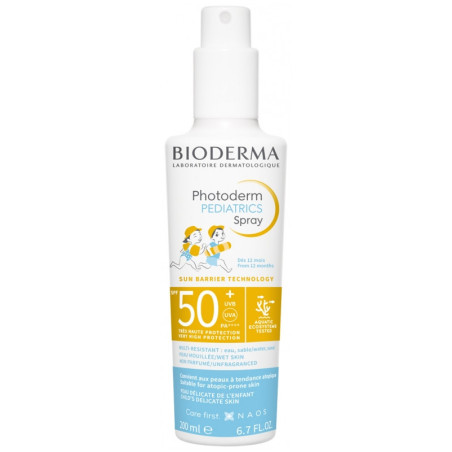 Bioderma Photoderm Pediatrics Spray SPF50+ 200 ml est une très haute protection large spectre adaptée à la peau délicate des enfants.