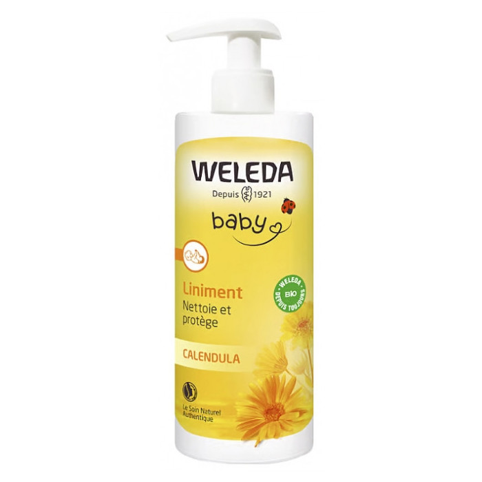 Weleda Baby Liniment Calendula 400 ml est un soin nettoyant pour le change, qui nettoie et protège la peau fragile de Bébé.