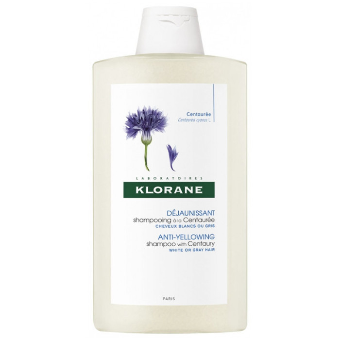 - Klorane Shampoing Déjaunissant à la Centaurée 400 ml est raviveur d'éclat et déjaunissant. Il est spécialement indiqué pour les cheveux blancs ou gris.