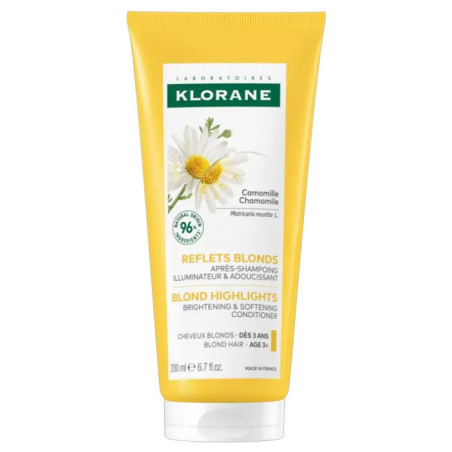 Klorane Illumine - Cheveux Blonds Après-Shampoing à la Camomille 200 ml est un après-shampoing naturel à la camomille. Ses agents démêlants doux démêlent instantanément les cheveux, sans les alourdir. Il répare la fibre capillaire en douceur et referme les écailles du cheveu. Il illumine naturellement les cheveux blonds et châtains, naturels ou méchés et révèle tous leurs reflets. Parfaitement hydratée et démêlée, la chevelure s'illumine, ses reflets blonds sont accentués et son éclat ravivé dans un doux parfum d'enfance.