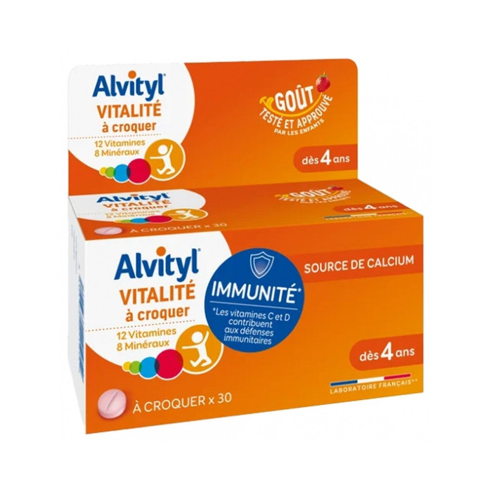 Alvityl Vitalité 30 Comprimés à Croquer est un complément alimentaire dont la formule associe 12 vitamines et 8 minéraux spécialement dosés pour couvrir 100% des valeurs nutritionnelles de référence en vitamines et ainsi :