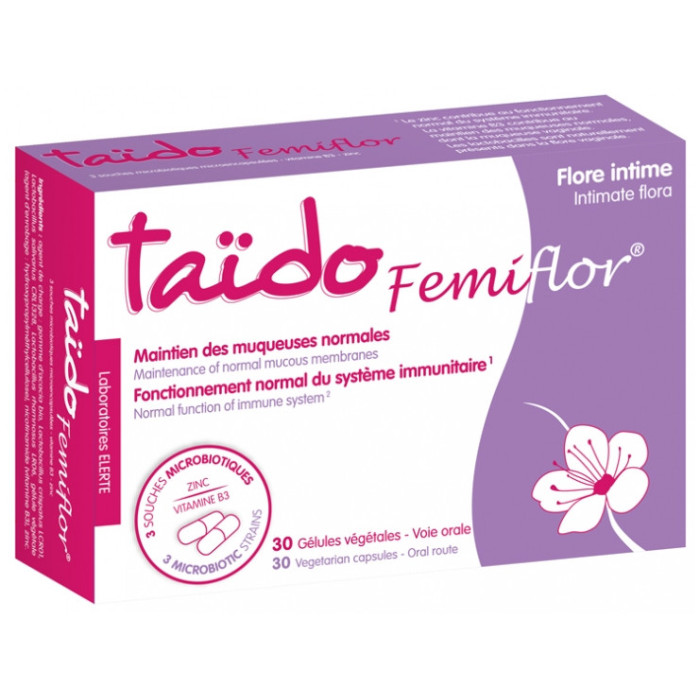 Taïdo Femiflor 30 Gélules Végétales est un complément alimentaire à base de 3 souches microbiotiques microencapsulées (Lactobacillus crispatus LCR01, Lactobacillus salivarius CRL1328, Lactobacillus rhamnosus LR06), vitamine B3 et zinc.
