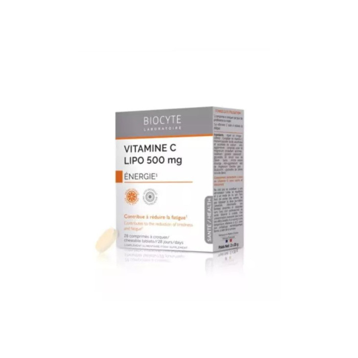Vitamine C Lipo 500 mg des Laboratoires Biocyte, complément alimentaire à base de vitamine C liposomée reconnue pour contribuer à réduire la fatigue.