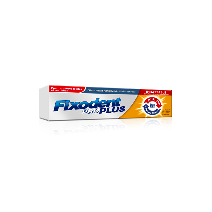 Crème adhésive pour prothèse dentaire Fixodent Pro Plus Premium à la saveur neutre, spécialement conçue pour offrir la meilleure tenue de toute la gamme Fixodent.