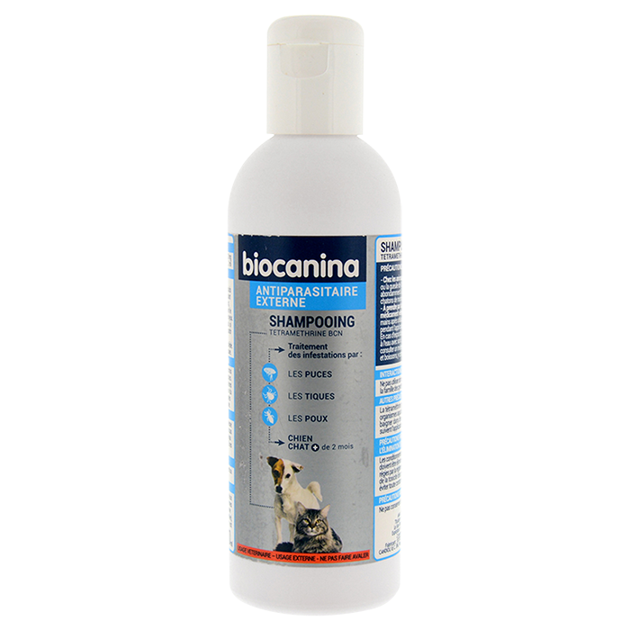 Biocanina Shampooing Antiparasitaire Externe est un shampooing traitant des infestations par les puces, les tiques et les poux. Il convient aux chiens et aux chats de plus de 2 mois.
