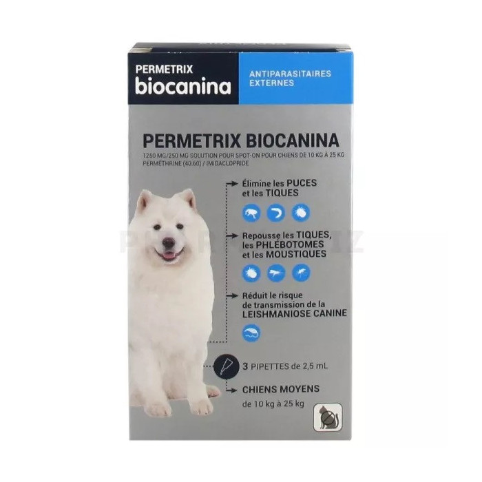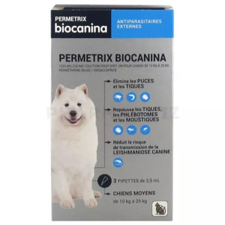 Biocanina Permetrix Chiens Moyens 3 Pipettes est une solution pour spot-on pour chiens de 10 kg à 25 kg qui agit contre les parasites externes :