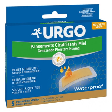 Urgo Pansements Cicatrisants Miel 5 Pansements Stériles sont des pansements stériles waterproof pour le traitement des brûlures du 1er et 2nd degré et des plaies superficielles exsudatives ou non exsudatives.