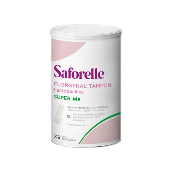 Saforelle Florgynal Tampon Applicateur 9 Super est un tampon avec applicateur sans plastique pour une insertion facile, qui absorbe les flux menstruels.Il contient un cordon d'extraction en coton et un bloc de sécurité.Le tampon libère des probiotiques Lactobacilles : L.Rhamnosus, L.Gasseri, L.Fermentum pour rééquilibrer votre flore vaginale.