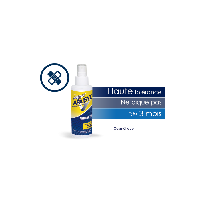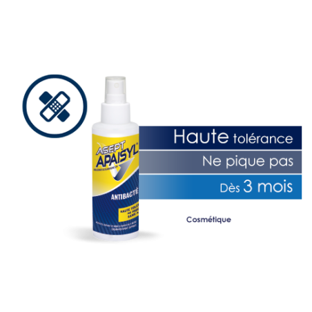 Le spray antibactérien Asept Apaisyl est un antibactérien de première intention, efficace sur les bactéries responsables d'affections cutanées. Il est enrichi en acide lactique, et respecte le pH physiologique de la peau. Ce spray antibactérien contribue à assainir et purifier l'épiderme par application directe et ne pique pas. Il est hautement toléré par les peaux fragiles. Sa formule incolore ne tache pas. Pratique, son conditionnement en spray facilite l'application en limitant les gestes douloureux.Sans alcool, sans parfum, sans paraben.