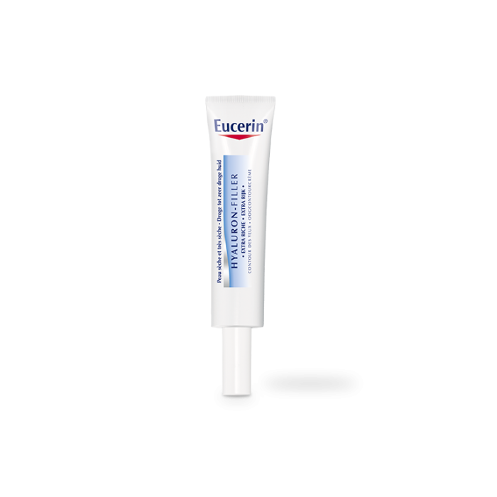 EUCERIN HYALURON-FILLER EXTRA RICHE Contour des Yeux combine des principes actifs qui hydratent, combattent les rides et protègent des effets néfastes des UVA, tout cela en un seul et unique soin. La technologie Urea retient l'humidité, la Technologie HYALURON-FILLER réduit visiblement les rides et ridules, et les filtres anti-UVA préviennent du vieillissement cutané prématuré dû aux UVA.