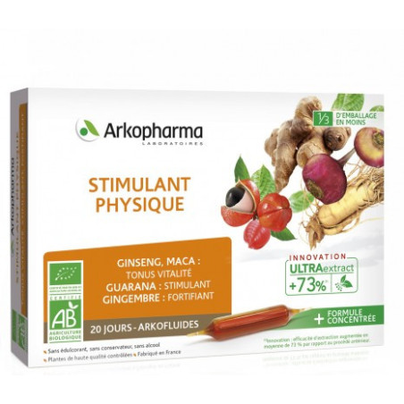 Arkofluides Stimulant Physique Bio est composé de plantes rigoureusement sélectionnées : Le Ginseng, cultivé depuis des millénaires en Asie pour sa racine appelée «fleur de vie» et la Maca, racine originaire des Andes péruviennes, aident à stimuler la vigueur physique et à lutter contre la fatigue. Dynamisant, le Guarana possède des propriétés toniques qui vous aideront à augmenter votre vitalité. Enfin, le Gingembre aide à renforcer les défenses naturelles de l’organisme. Réservé à l’adulte et à l’adolescent de plus de 15 ans. Contient de la caféine, déconseillé aux enfants et aux femmes enceintes ou allaitantes (teneur en caféine de l’ordre de 5 mg par ampoule). Non recommandé en cas de prise simultanée d’anticoagulants (type AVK). L’usage concomitant d’autres stimulants n’est pas conseillé. Un complément alimentaire ne doit pas se substituer à une alimentation variée et équilibrée et à un mode de vie sain. Ne pas dépasser la dose journalière recommandée. Ne pas laisser à la portée des jeunes enfants. AB - Agriculture Biologique Sans alcool Sans conservateur Sans édulcorant