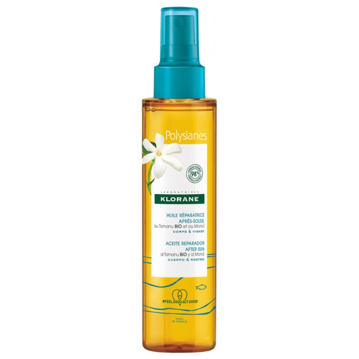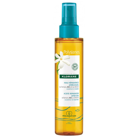 Klorane Polysianes Huile Réparatrice Après-Soleil au Tamanu Bio et Monoï 150 ml est un véritable élixir pour la peau du corps et du visage.