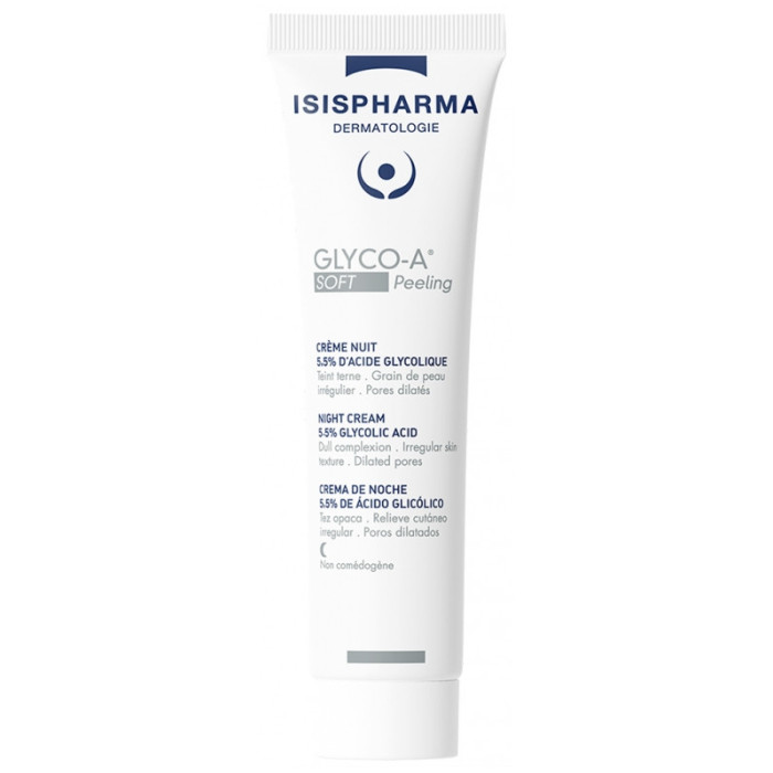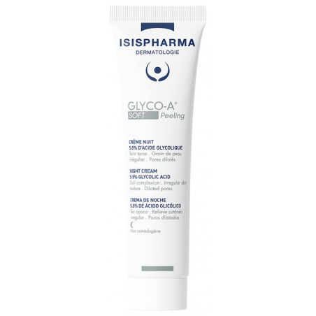 Isispharma Glyco-A Soft Peeling Crème Nuit 30 ml est un soin concentré en acide glycolique, spécialement conçu pour réduire les imperfections légères telles que le teint terne, les pores dilatés et le grain de peau irrégulier.