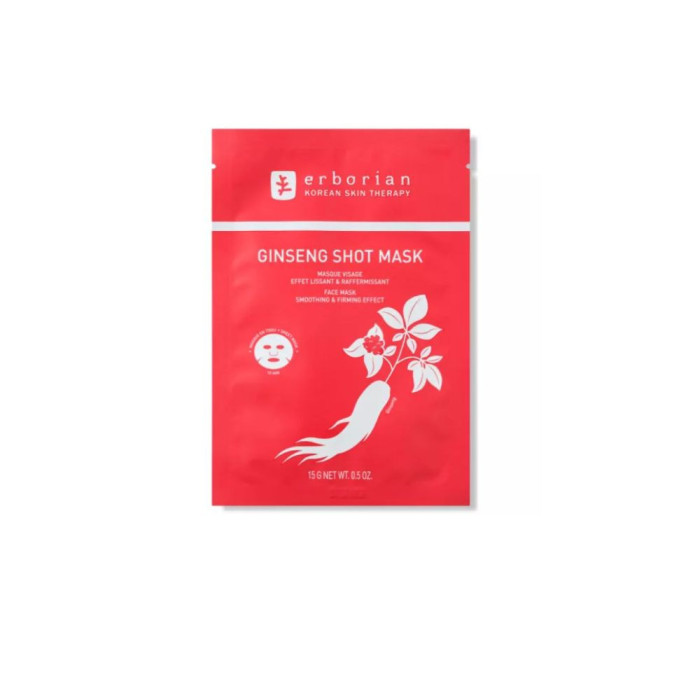 Erborian Masque visage lissant Ginseng Shot Mask est un masque en tissu conçu spécifiquement pour lisser et raffermir votre visage. En effet, avec l'âge, l'organisme produit naturellement moins d'acide hyaluronique, molécule qui joue un rôle essentiel notamment dans l'hydratation et la fermeté de la peau. Résultat : la peau perd son hydratation naturelle et devient plus terne et inconfortable.