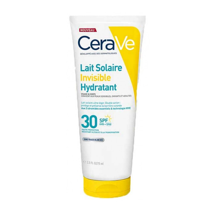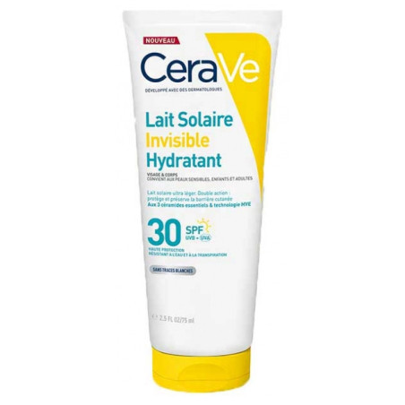CeraVe Lait Solaire Hydratant Invisible SPF30 75 ml est une protection solaire haute performance adaptée à tous les types de peau, même sensibles, pour le visage et le corps.